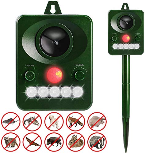 Seleccionamos este ahuyentador de la marca Intey con un potente ultrasonido que no afecta humanos. Puede cargar con energía solar de 4 a 6 horas, tiene una alta eficiencia y bajo consumo de energía. La carcasa es resistente a prueba de viento, lluvia y nieve. Es un repelente ultrasónico con sensor de movimiento y luz estroboscópica. Se pueden seleccionar diferentes modos para ajustar la sensibilidad del sensor.